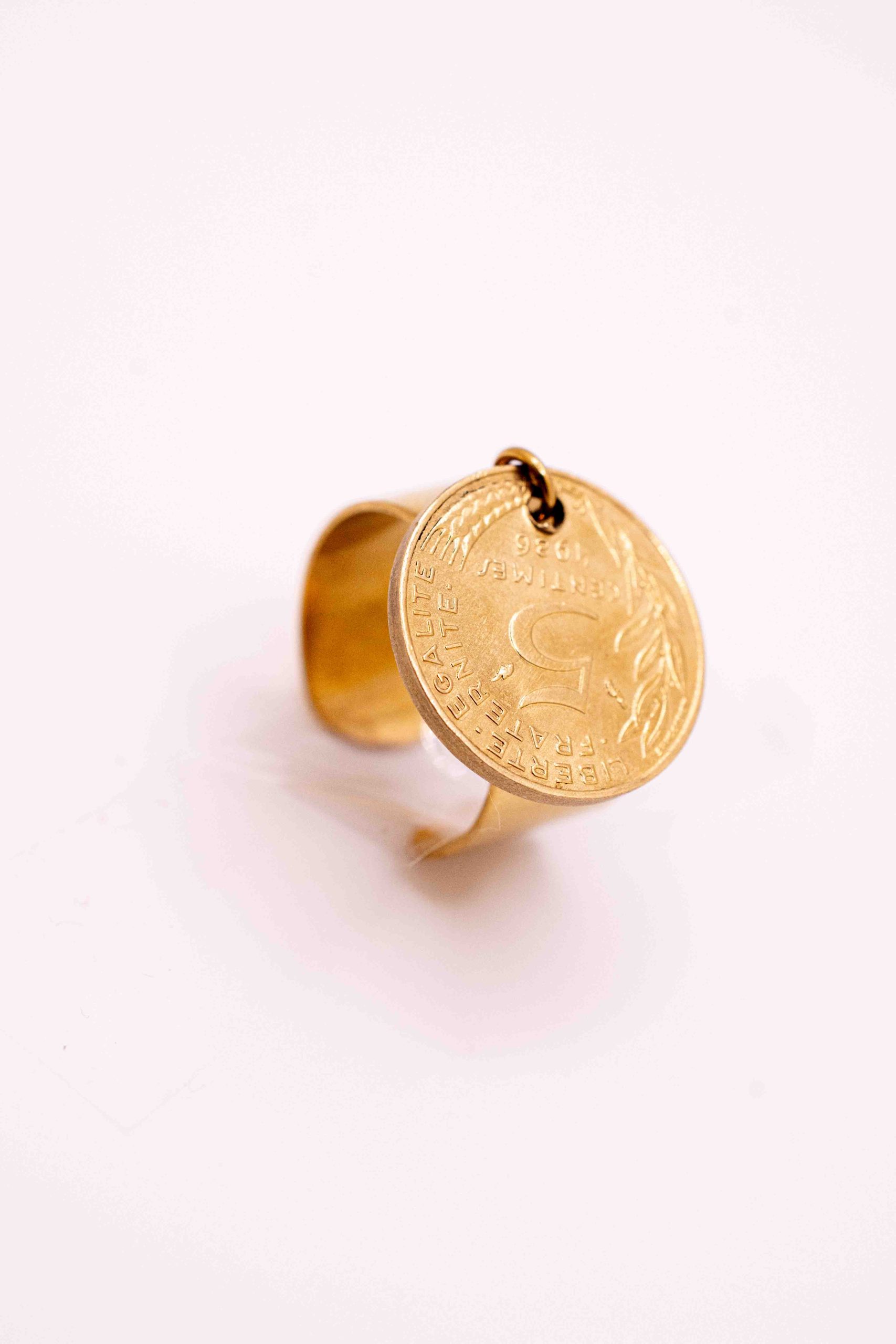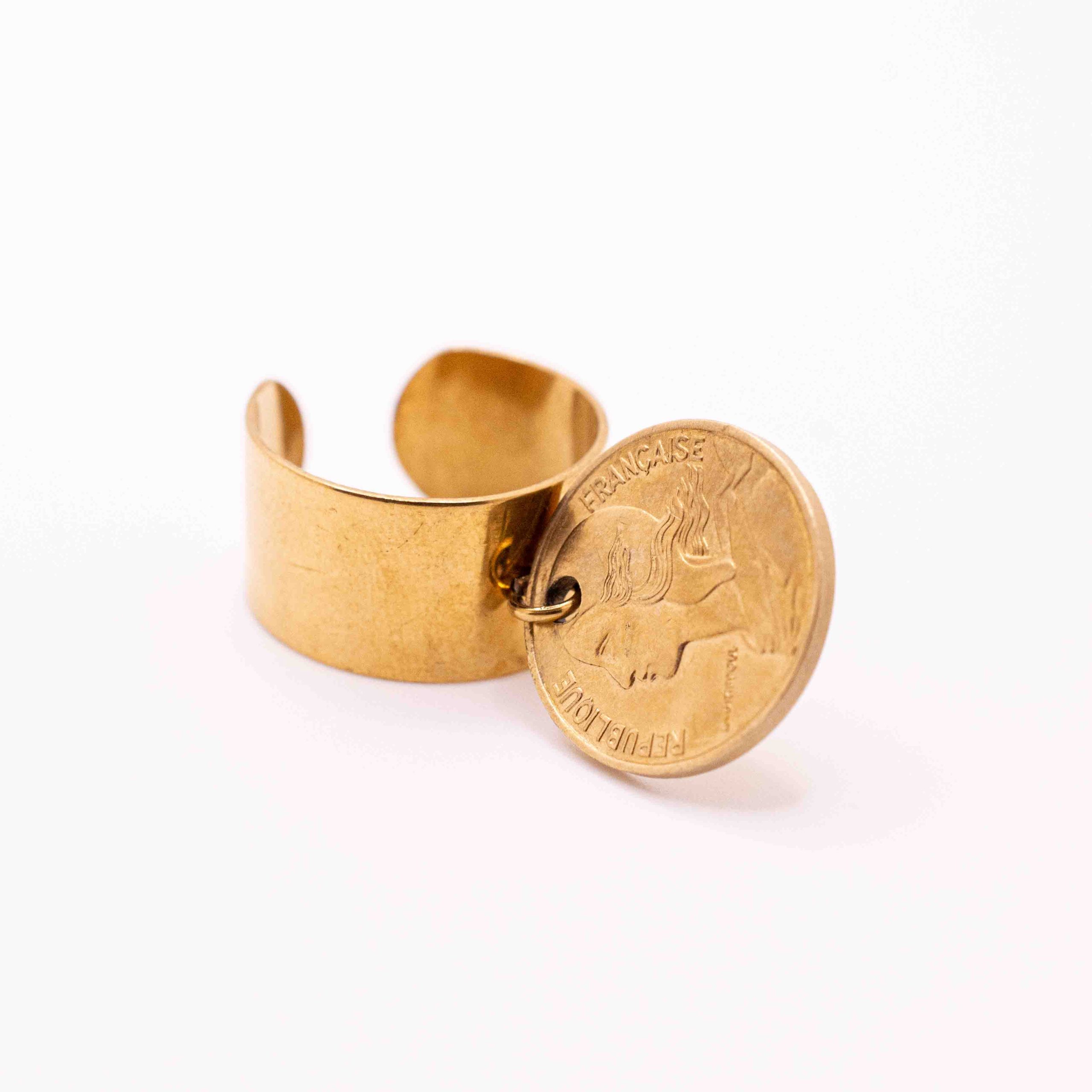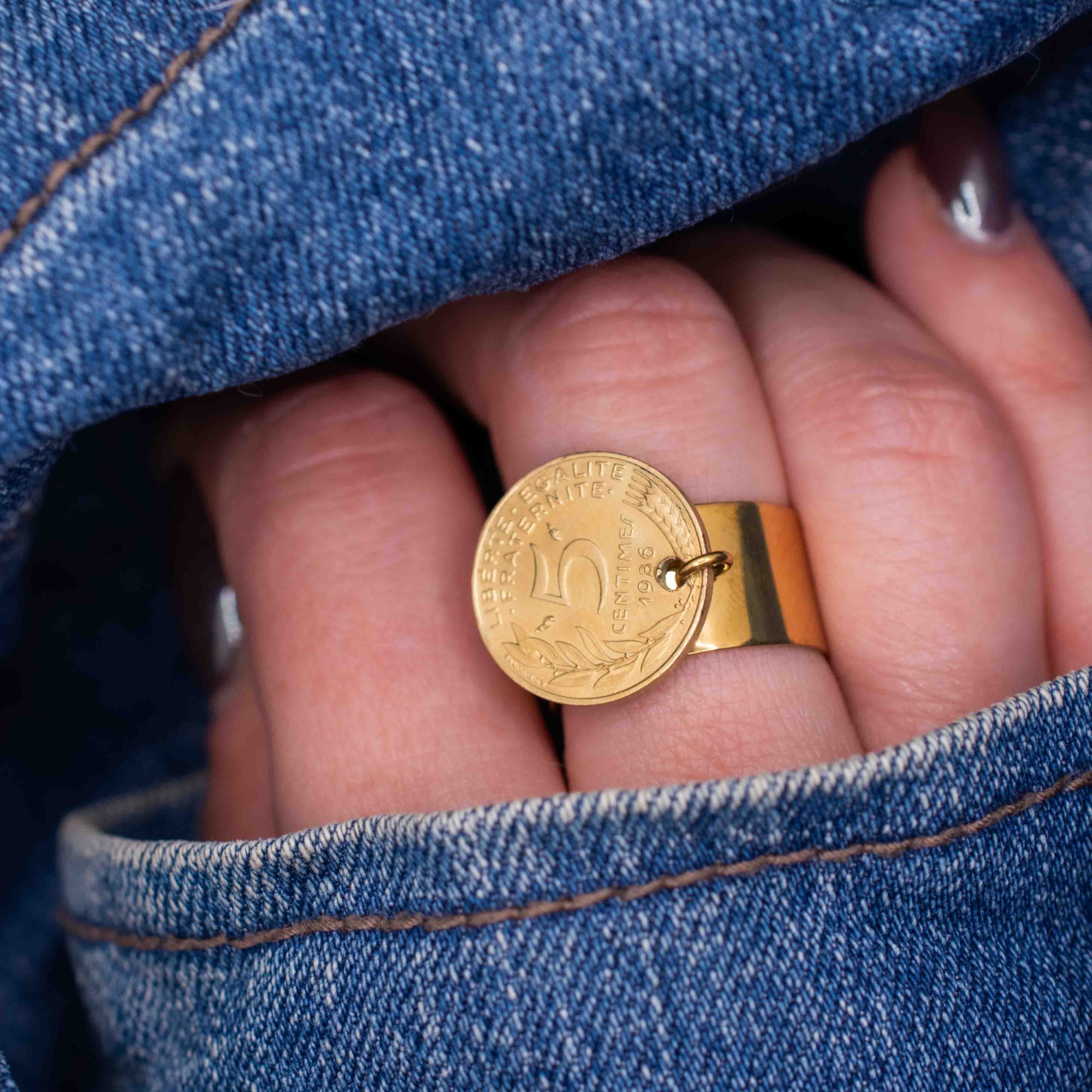 Avec son anneau large et sa pièce de franc en breloque, Gabrielle impose son style sans effort.